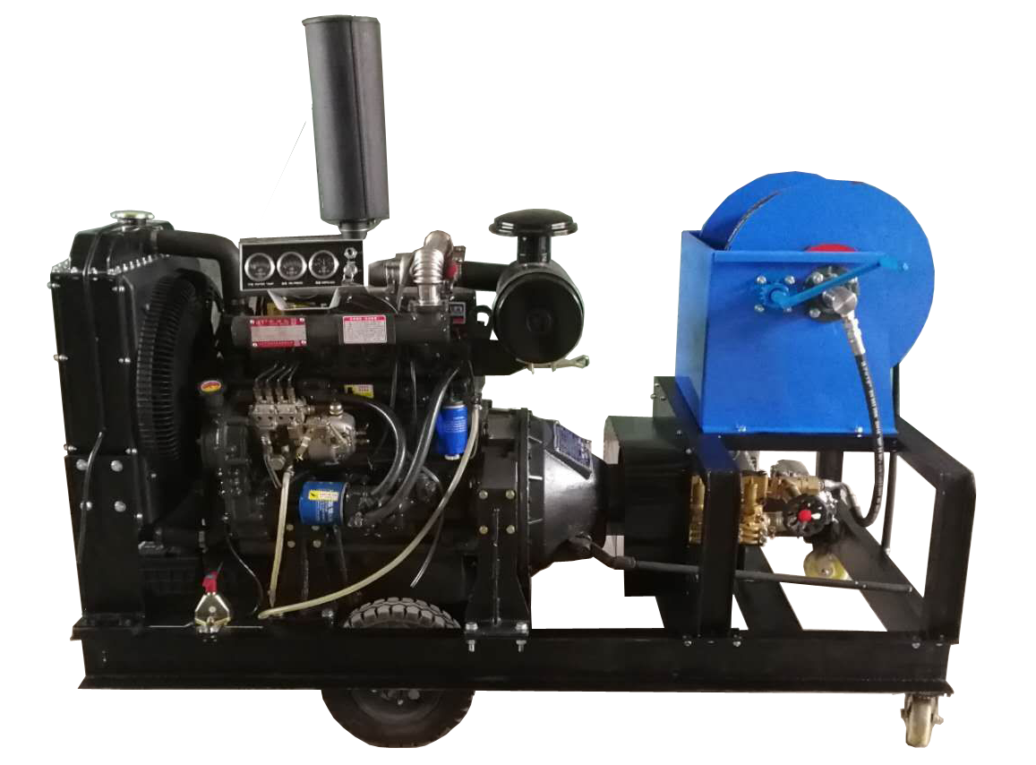 高壓水管道疏通機用于疏通和清除管道中的嚴重堵塞物和污垢。高壓柱塞泵由柴油機驅動。利用高壓水射流產生的反作用力,帶動噴嘴帶動橡膠管在管路中向前運動,清除管路中的污垢。當噴水器到達管道的另一端時,橡膠管在卷盤張力的作用下被迫向后移動。此時,高壓水射流掃管壁,將管外雜物帶走,達到清洗管道的目的。