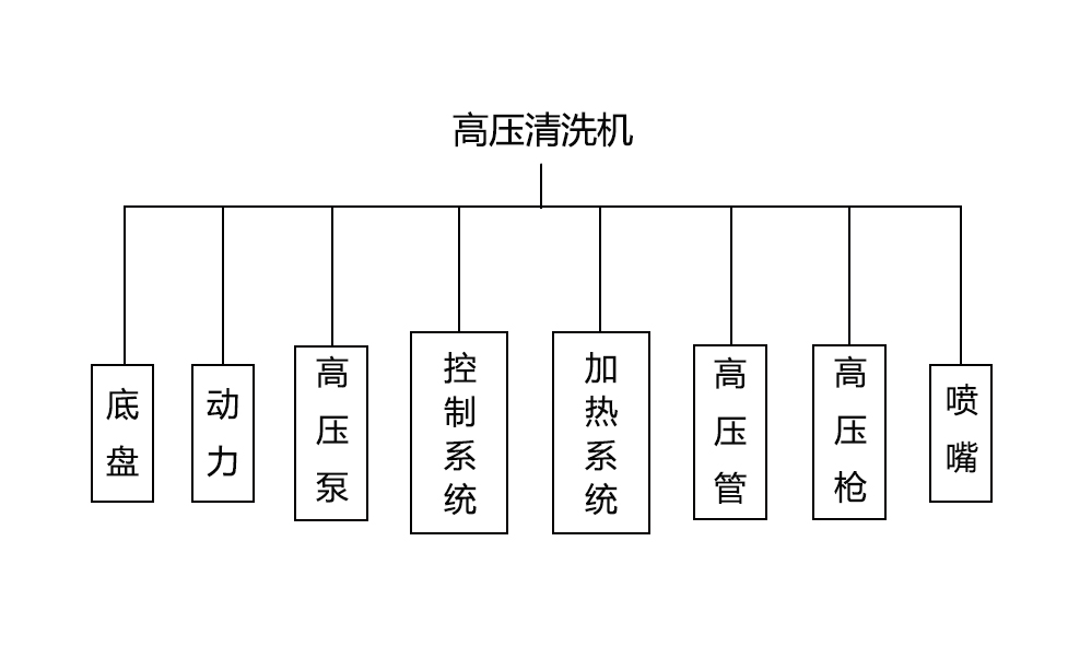 高壓清洗機組成部分:底盤-動力-高壓泵-控制系統-高壓管-高壓槍-噴嘴。